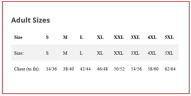 | Chest To Fit (ins) | 34-36 | 38-40 | 42-44 | 46-48 | 50-52 | 54-56 | 58-60 | 62-64 |